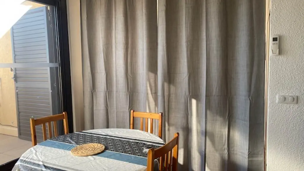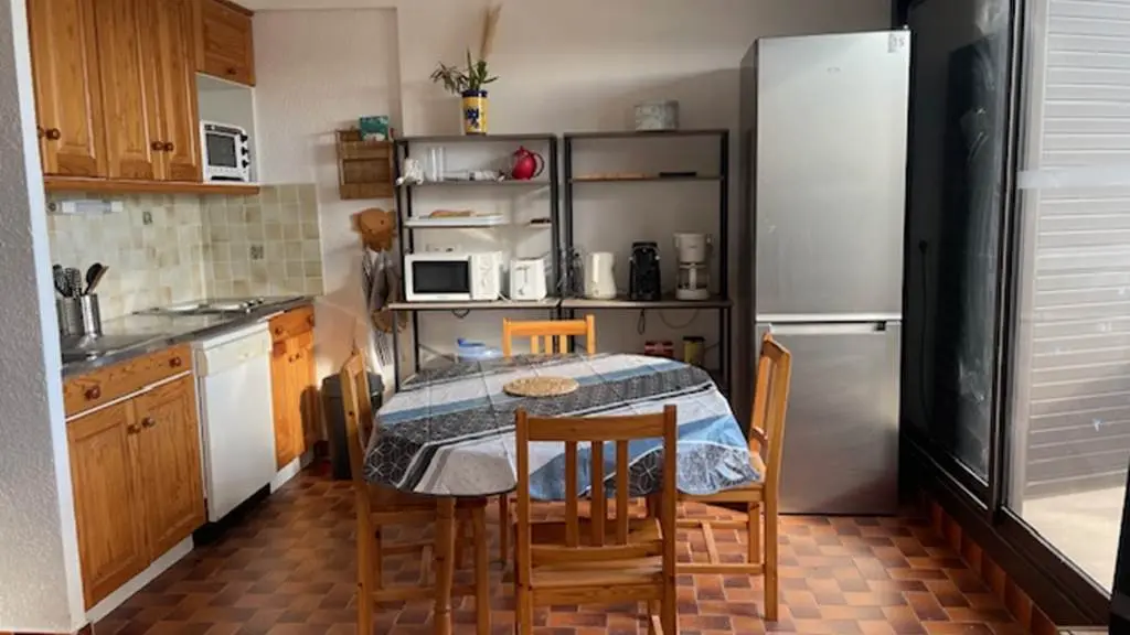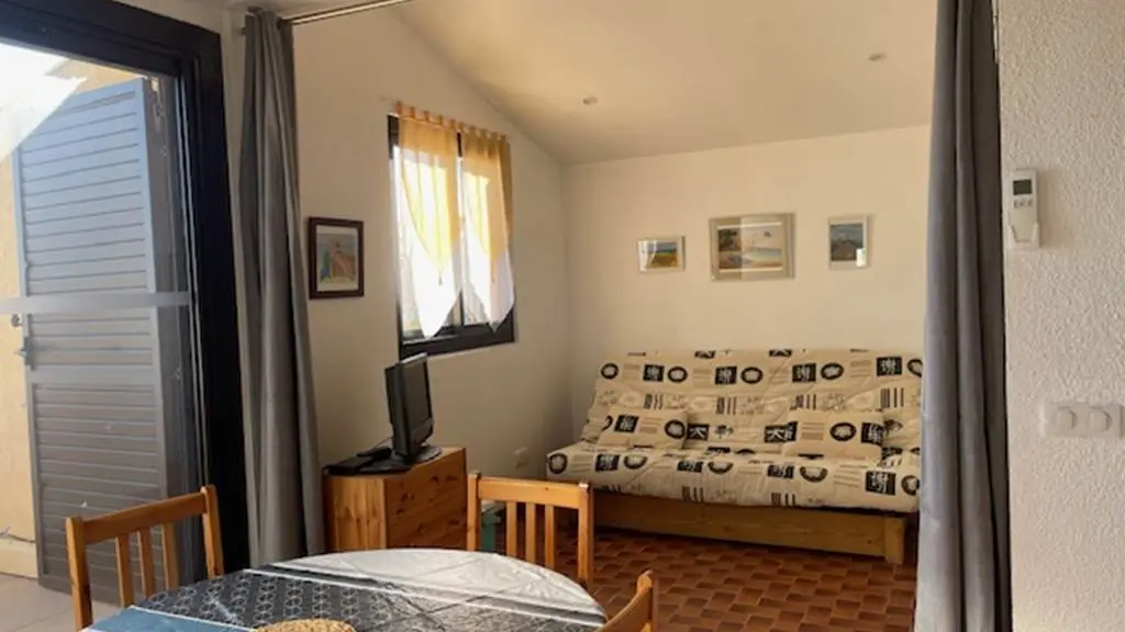 Una amplia habitación que se puede dividir con una cortina opaca , con un sofá cama (140 x 190 cm) a un lado y una cocina totalmente equipada al otro. Por lo tanto, puede servir como amplio salón durante el día (con televisor) y como dormitorio/cocina por la noche.